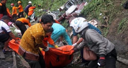 ইন্দোনেশিয়ার জাভায় পর্যটকবাহী একটি বাস পাহাড় থেকে পড়ে উল্টে গেলে কমপক্ষে ২৭ জন নিহত হয়েছেন। পুলিশ বলছে, বাসটি পাহাড় থেকে নিচে পড়ে যাওয়ার আগে একটি মোটরসাইকেলকেও ধাক্কা দেয়। তারা বলছে, দুর্ঘটনার সময় বাসটির ব্রেক ঠিকমতো কাজ করছিল না।
